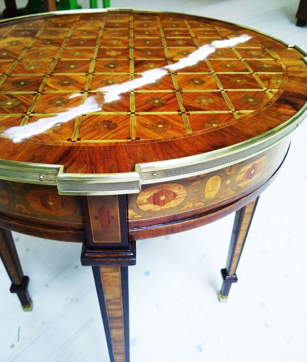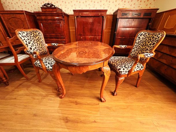 Zwei Sessel und ein Tisch: historische Substanz, meisterlich restauriert und wieder voll funktionsfähig.